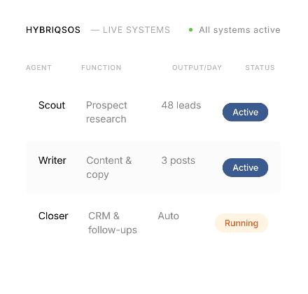 You get the exact same system AscendX uses to build and exit ventures: HybriqsOS — an autonomous AI operating system that handles marketing, sales, and operations for you.