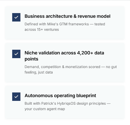 Before HybriqsOS touches anything, The AscendX Founding Team sits down with you directly. This is not a course. This is expert consultation — the same strategic work they do when building their own ventures, applied to yours.